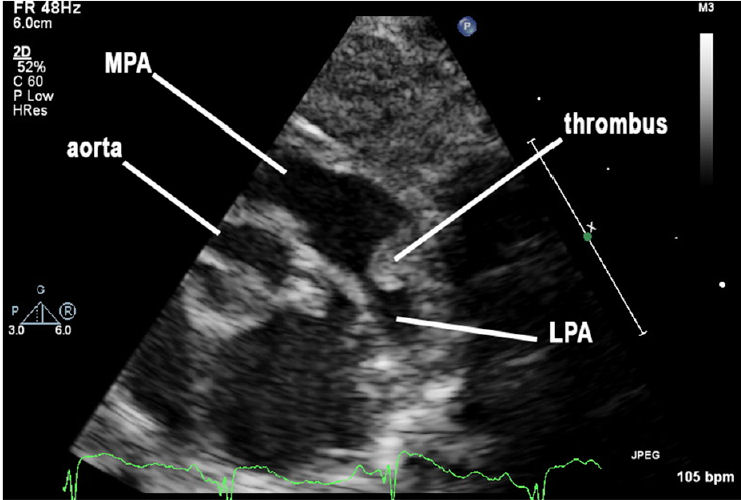 Un hallazgo incidental de trombo del ductus arterioso que se extiende a arteria pulmonar principal y arteria pulmonar izquierda se descubrió en la ecocardiografía (Figuras 1 y 2).