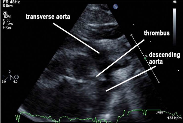 Figura 2.- Las imágenes ecocardiográficas capturadas a lo largo de la vista supraesternal de la muesca demuestran el arco aórtico. Aquí se ve el trombo del ducto arterioso permeable que sobresale en la aorta descendente.